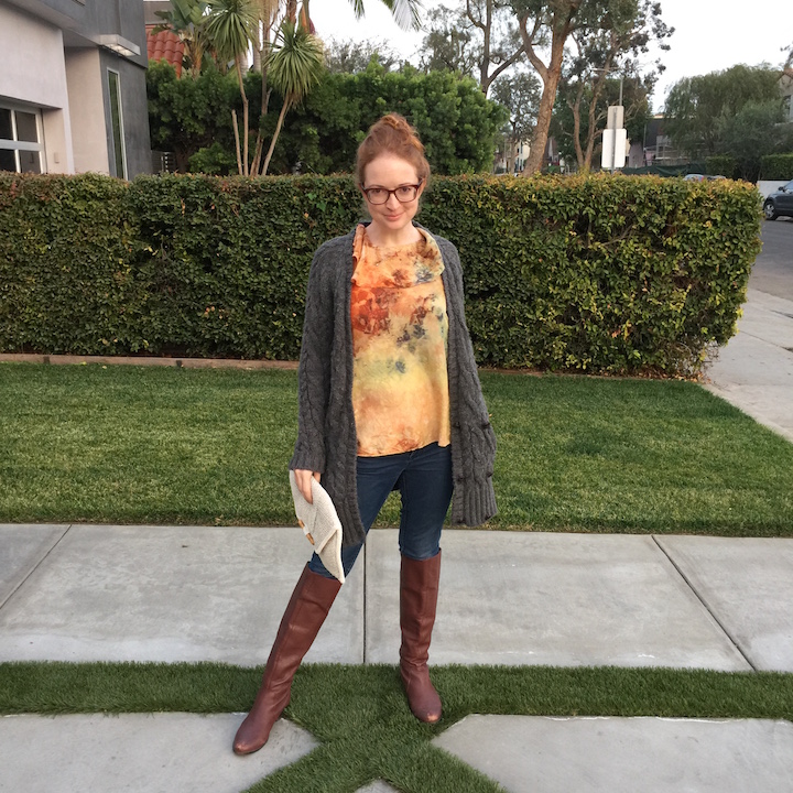 The outfit was perfect for low-key dinner when paired with my favorite grey sweater coat and my thrifted Halston boots! I also paired it with this ivory vintage clutch that's currently in the NDAD shop!